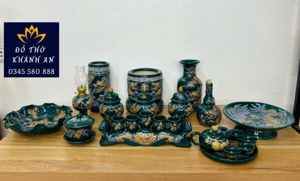 Bộ đồ thờ men màu đắp nổi hội tụ đầy đủ yếu tố thẩm mỹ và tâm linh. Sản phẩm vừa đẹp vừa bền theo thời gian.